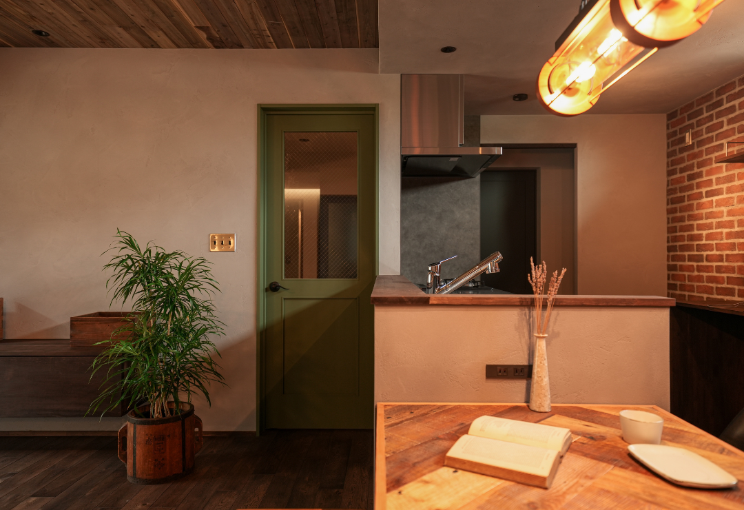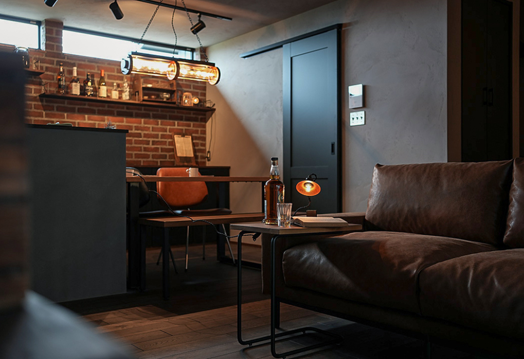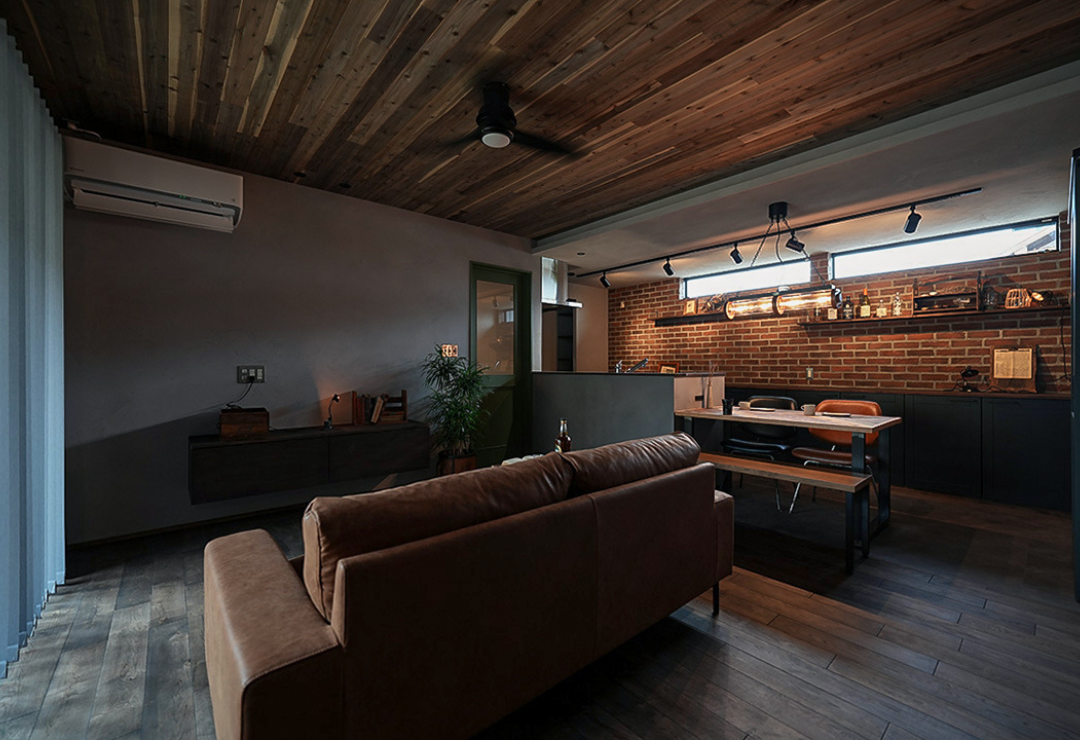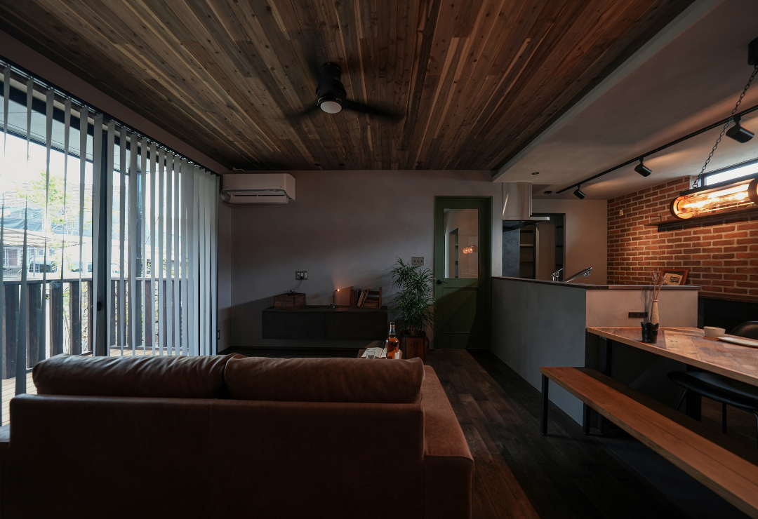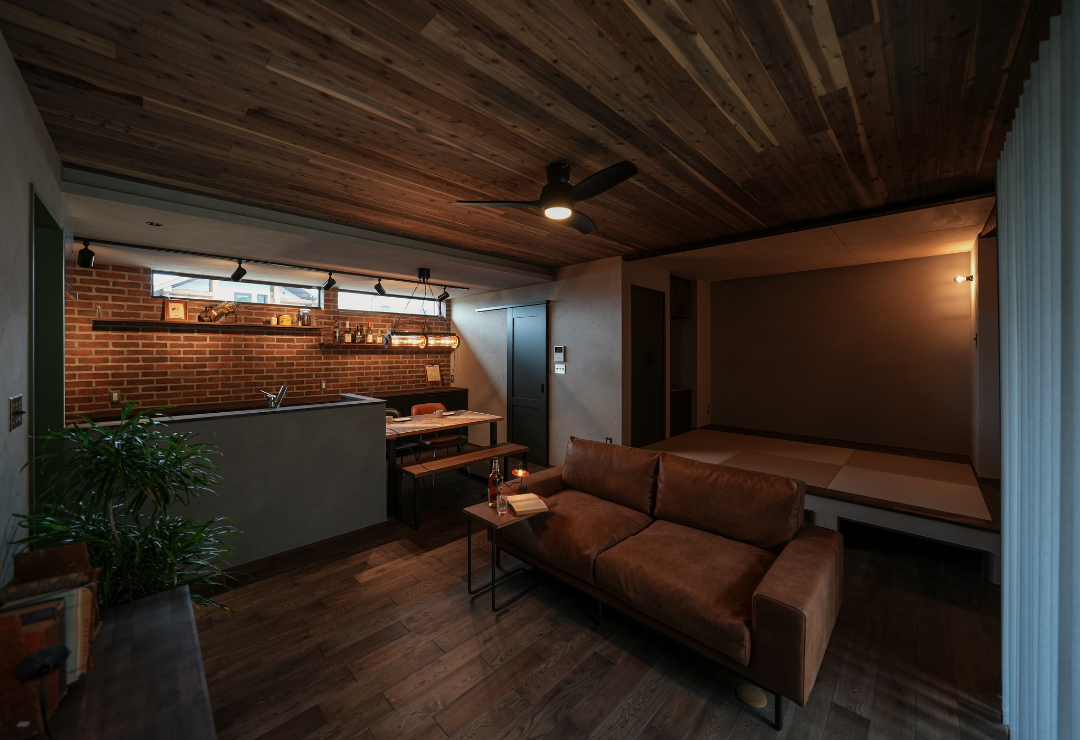 天井の無垢ウッドパネル、壁面のレンガ、そしてキッチンカウンターのモルタル質感が響き合い、ブルックリンカフェのような落ち着きを演出します。リビングの一角に設けた、段差を活かした畳コーナー。下部には大容量の引き出し収納を完備し、美しさと実用性を両立させました。最大の特徴は、平屋のメリットを最大限に活かした「究極の横移動動線」。