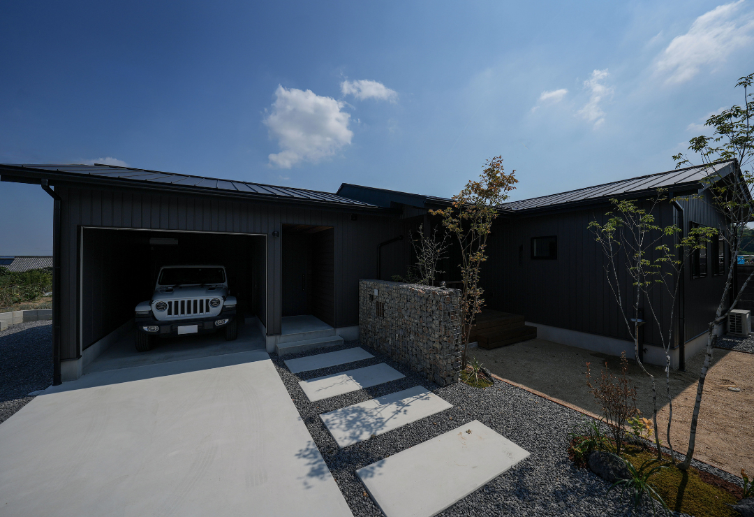 マットブラックのガルバリウムを纏った、重厚感あふれる外観の平屋。リビングとフラットに繋がるウッドデッキが広がり、「外からのプライバシー確保」と「内への開放感」を究極のバランスで両立させました。
