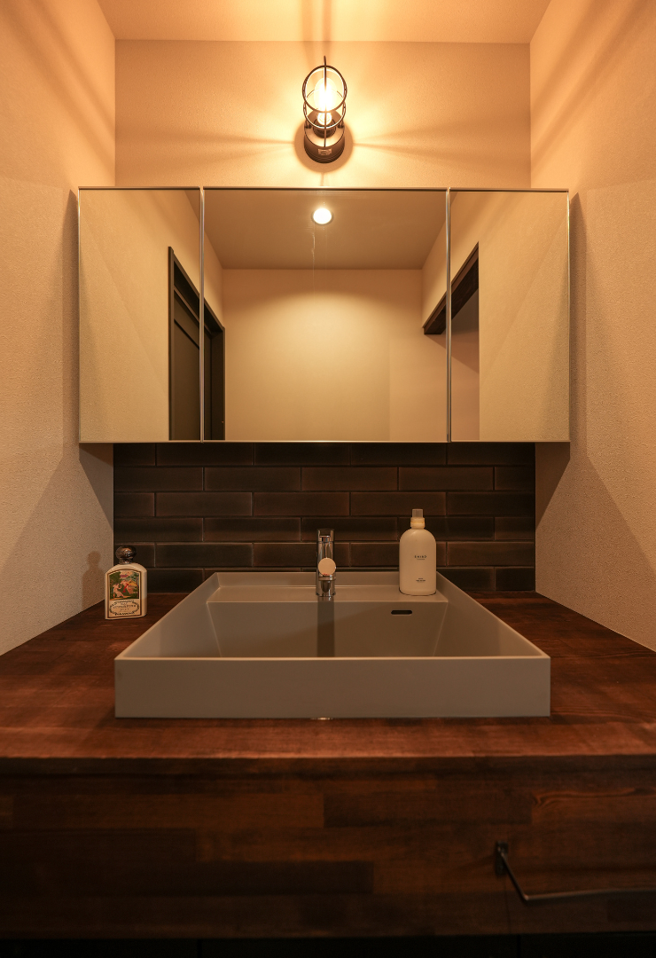 - 壁一面の鏡は収納スペースとして使えるのですべてを扉の中に収め、生活感を隠し急な来客時も慌てる必要がありません。