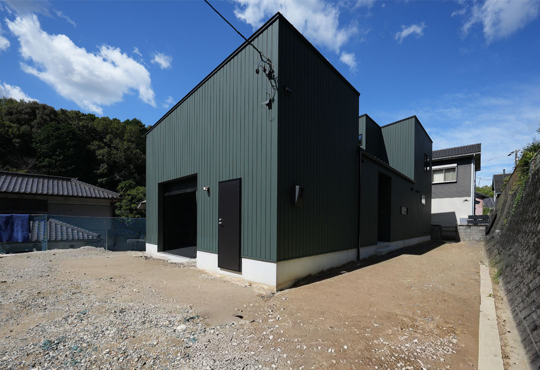 外壁には、耐久性と美しさを兼ね備えたダークグリーンの縦張りガルバリウム鋼板を採用。そのシャープなラインと深みのある色は、都会的でありながら自然とも調和するソリッド・モダンな外観を創り出します。