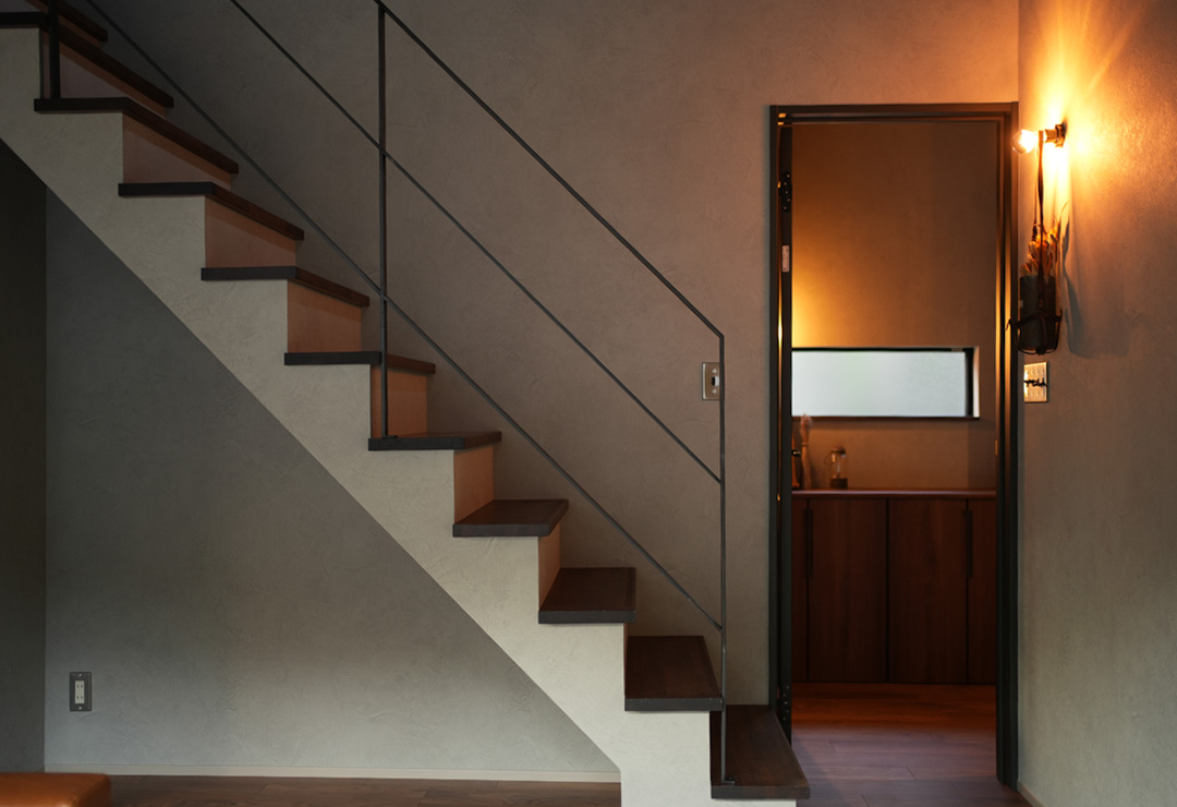 - 圧迫感のないアイアン手すりの階段が、縦方向の視線の抜けを確保。LDKデザインの一部として、空間の開放感とモダンな印象を強調します。