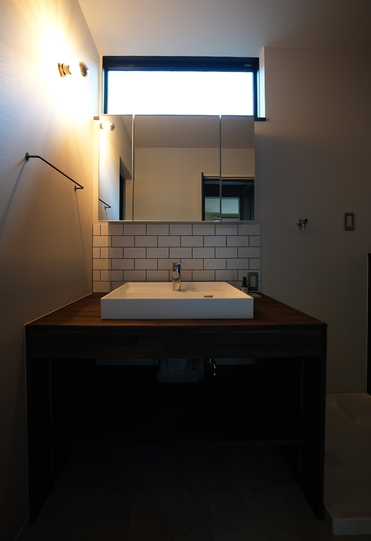 - ダークウッドのカウンターとサブウェイタイルを採用。必要なものはミラー裏に収納し、毎日のルーティンを心地よくする清潔感とデザイン性を両立しました。