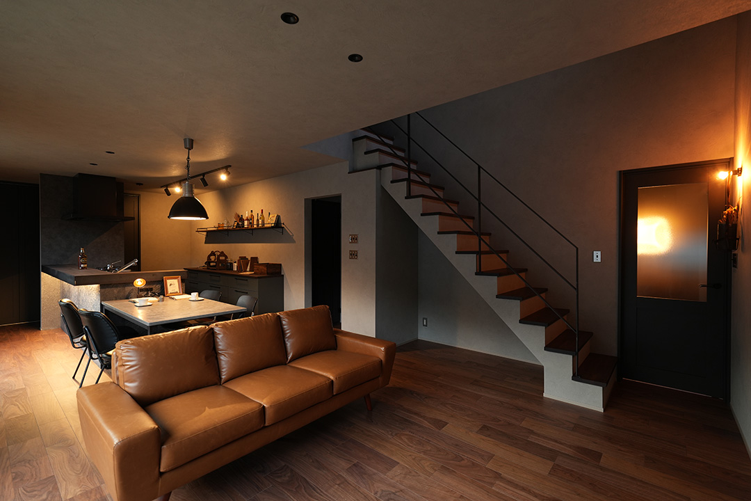 濃いブラウンの無垢床、落ち着いたグレージュの壁が、ベースとなる重厚感を創出。キャメル色のレザーソファや、光を巧みに操る照明計画が、まさに大人のためのプライベートラウンジを演出します。