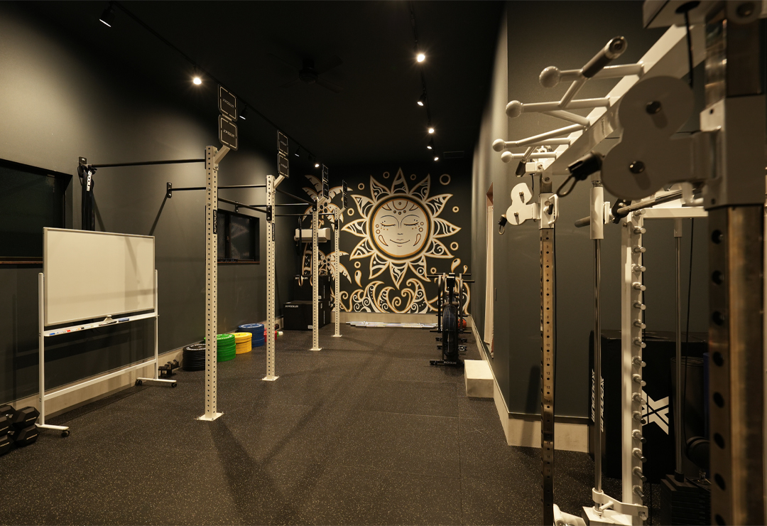- トレーニングスペースの大きな開口部は、機材の搬入や利用者の出入りがスムーズに行えます。季節によってはシャッターを開け放って解放感あふれる心地よいトレーニング環境を実現します。