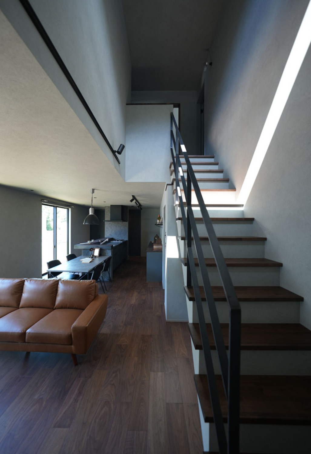 階段の直線美が際立つリビング空間です。間接照明が奥行きを引き立て、デザイン性と機能性を兼ね備えています。